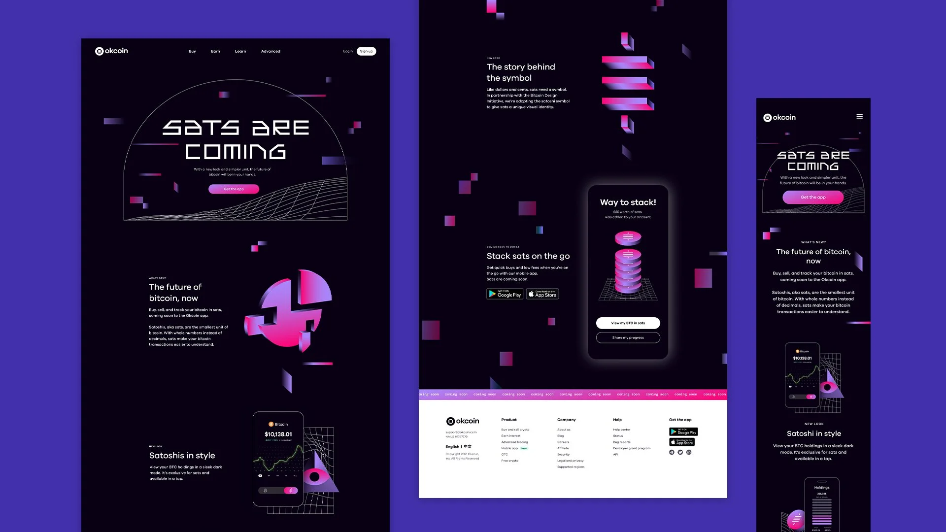 As part of my work at Okcoin, I led the art direction and visual design for their new product feature, Satoshi Mode, which lets you buy, sell and trade in Satoshis (the smallest denomination of Bitcoin)